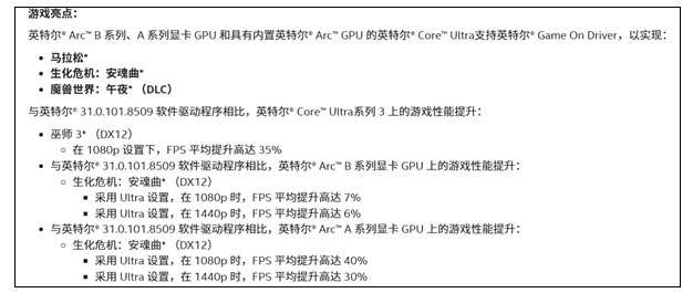 在Intel酷睿Ultra 300系列上,与31.0.101.8509驱动相比,游戏性能提升: