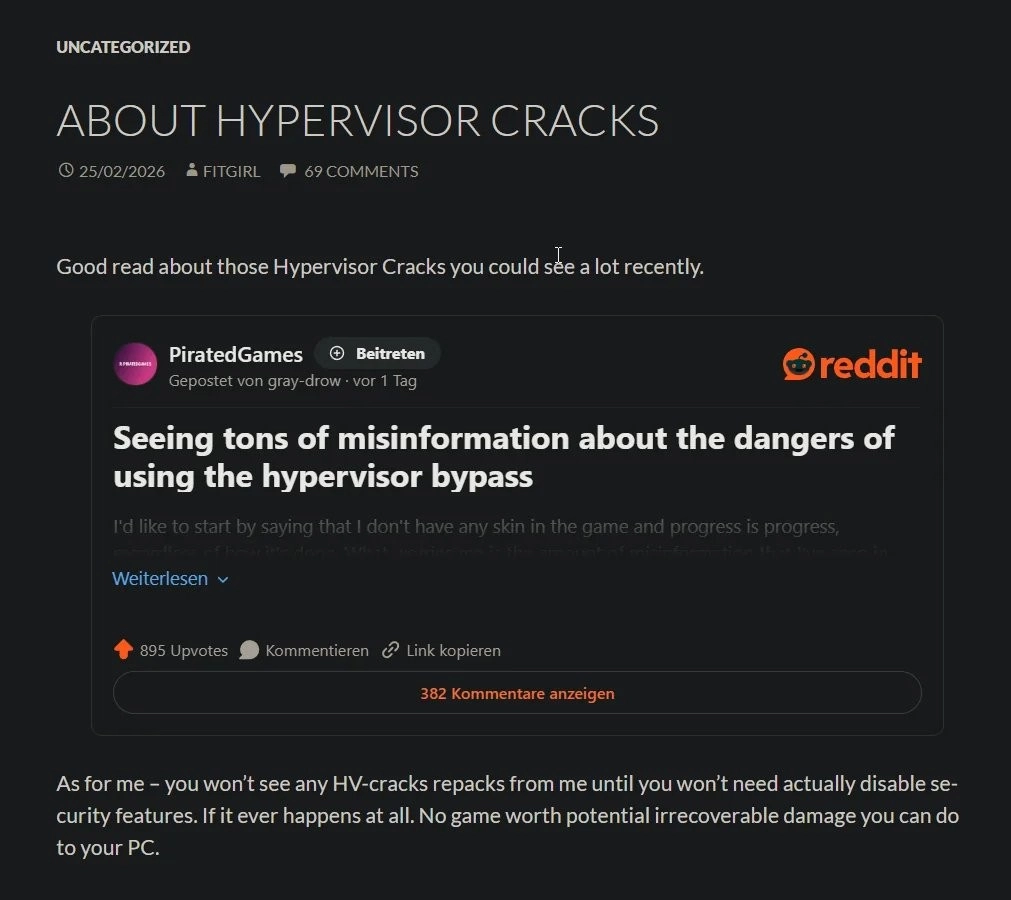 她表示,这类游戏要求用户关闭Windows的多项安全功能,或许会给电脑带来潜在风险。“对我来说,只要还得关闭安全功能,你们就不会看到我发布任何基于虚拟机监视器的压缩包——如果真有这种情况的话。没有哪款游戏值得你用电脑去冒可能造成不可逆损伤的风险。”