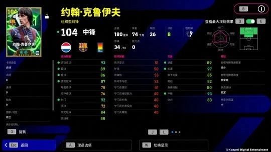克鲁伊夫拥有【射手本能 +3】的增能属性,让他的控球、射门与加速得到全面提升,配合【旋风盘带】的灵动步伐,让他成为前场难以预测的进攻发起者!而作为进攻核心,他的【无定型传球】在严密盯防下依然能送出穿透防线的关键一传,不断创造绝佳机会!
