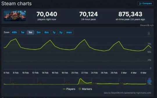 尽管已无法触及87.5万的离谱峰值,但发售近三年后的如今,《博德之门3》在Steam平台上依旧维持着日均7万的惊人在线人数,这背后离不开一群死忠玩家的鼎力支持。