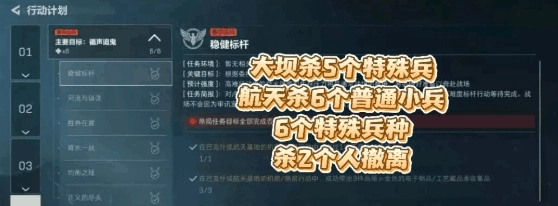 大坝杀5个特殊兵种,再去航天杀6个普通土兵,6个特殊兵种,杀2个人,中途不能断,需要起装备