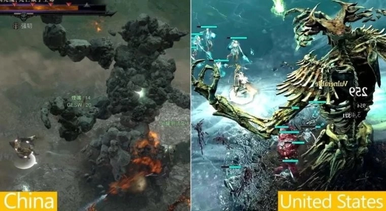最关键的改动是血液效果彻底消失。攻击时不再呈现大家熟悉的红色飞溅效果,而是出现类似尘埃的半透明棕色粒子。除此之外,开发人员对关键Boss——巨型骷髅进行了修改,在国内版本中它以魔像形态现身。普通骷髅敌人以及尸体也被换成了石像或者稻草人。另外,还存在部分过场剧情直接被语言文字取代的情况。