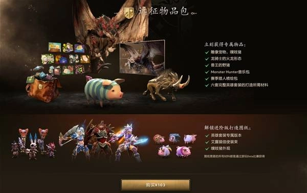 本次联动的基础款除了雕像宠物那个猪以外都是可以通过正常对局获得材料,但是基础款的升级解锁款式需要103元购入远征包解锁才能进行升级。