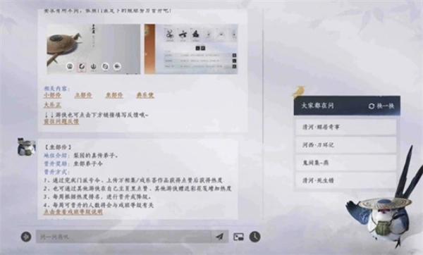 1、打开燕叽界面,与燕叽对话选择“询问梨园入门”;