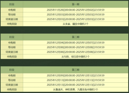 灵宠献瑞活动一共三期,第一期至第三期顺序开启。每期活动分为三个阶段,按顺序依次为申购期、等待期、结果展示期。活动申购有效时间内,玩家可以通过福利中心--【灵宠献瑞】界面查看本期奖励,同时点击【申购】按钮申购本期灵宠。申购完成后,将立即获得申购时所支付金元宝等值的银元宝,并额外获赠20%的银元宝。等待期结束后当天的20:00,在所有成功参与该活动的玩家当中,随机抽取其中一位玩家获得当期奖励。