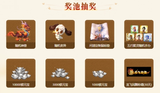 参与试道大会并与其他玩家战斗时至少胜利一场或参与了帮战战斗的玩家,可前往“逐鹿争锋”页面奖池抽奖,奖池包含随机神兽、变异、银元宝、问道周边、限时30天“龙飞凤舞”称谓奖励。