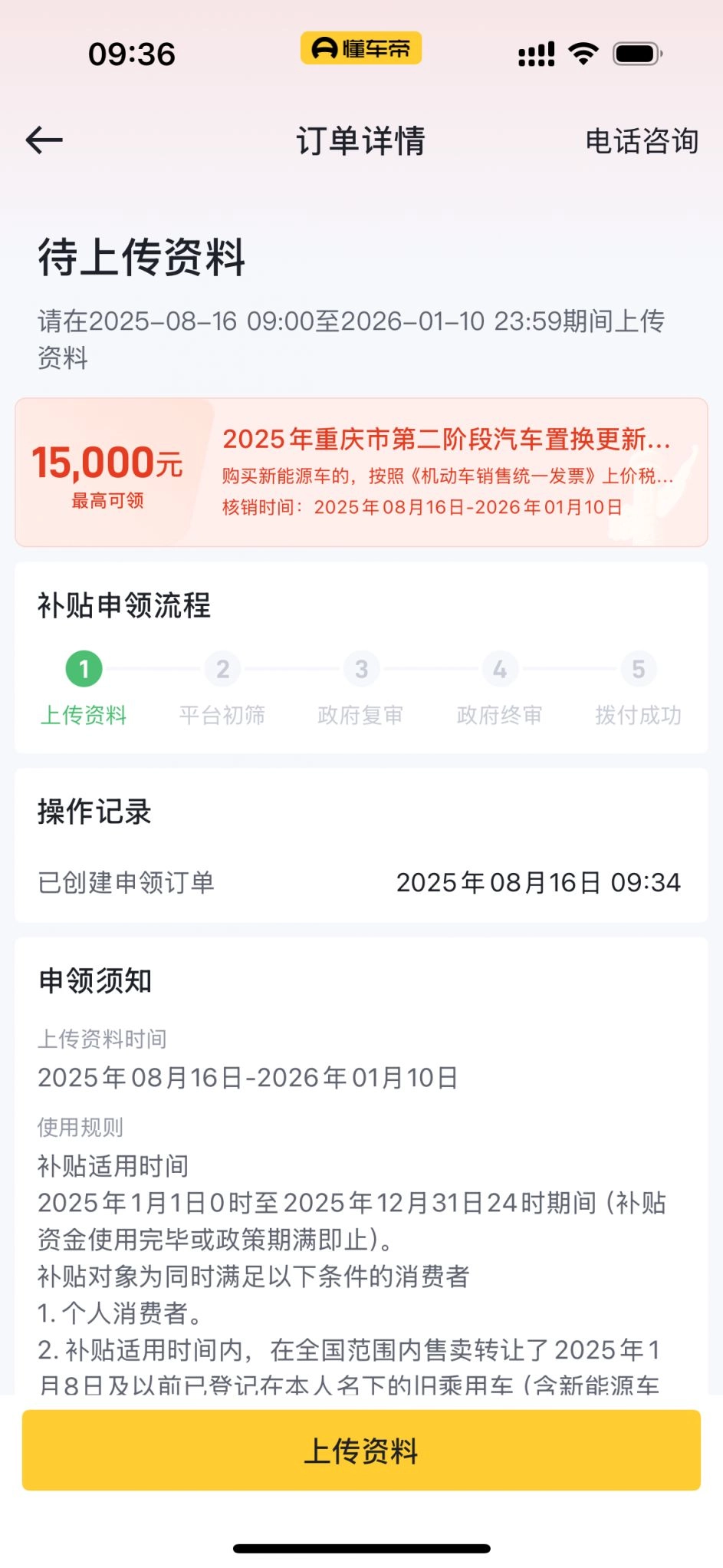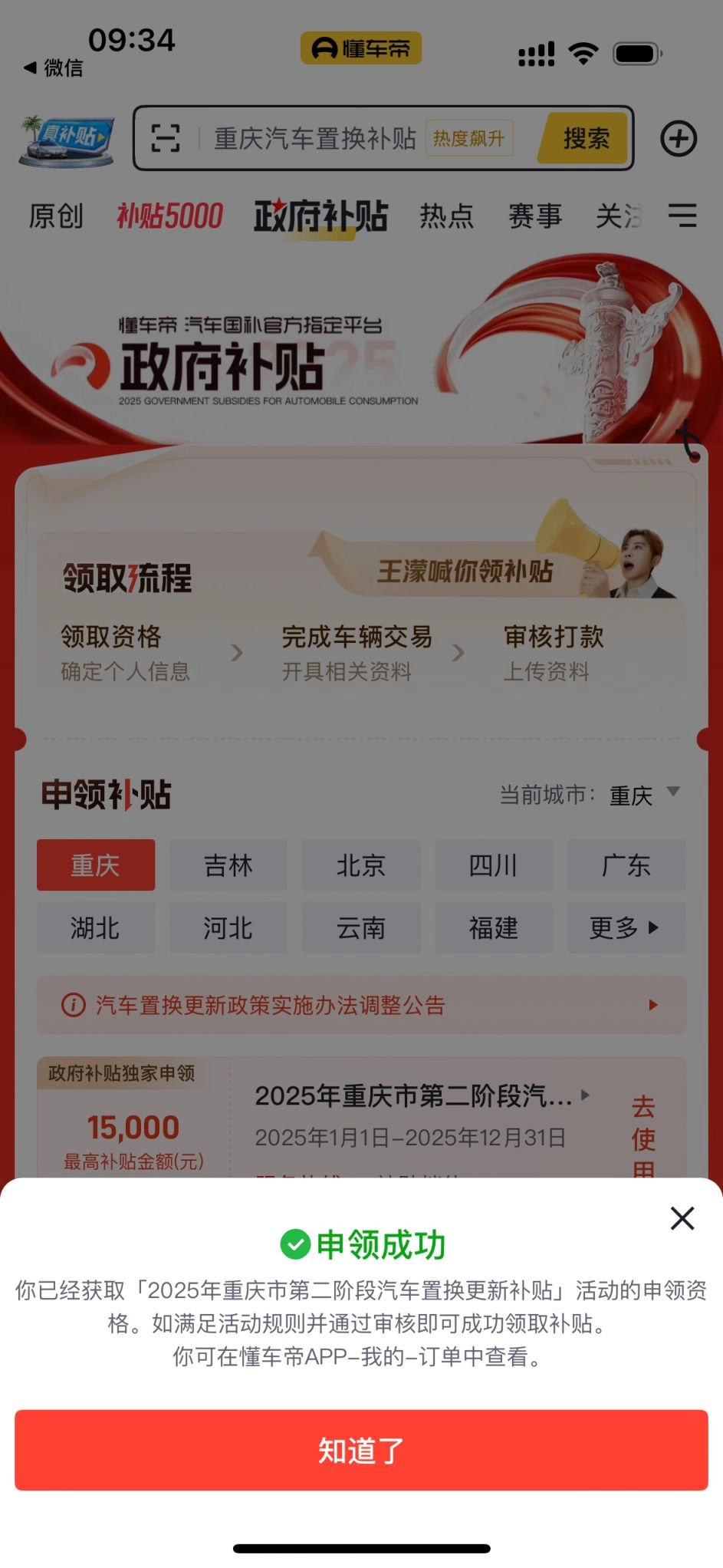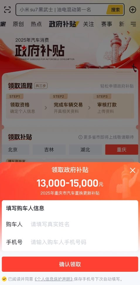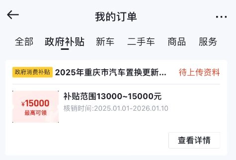 想换新车的重庆车主有福啦!为促进汽车消费,重庆推出了汽车置换更新补贴政策。在规定时间内售卖旧车,购置新车,最高可获 1.5 万元补贴。若你想申领这笔补贴,只需通过 “懂车帝” App 等渠道,按指引提交身份证、发票、行驶证等资料,审核通过后,补贴资金就会发放到账。下面就为你详解领取流程。