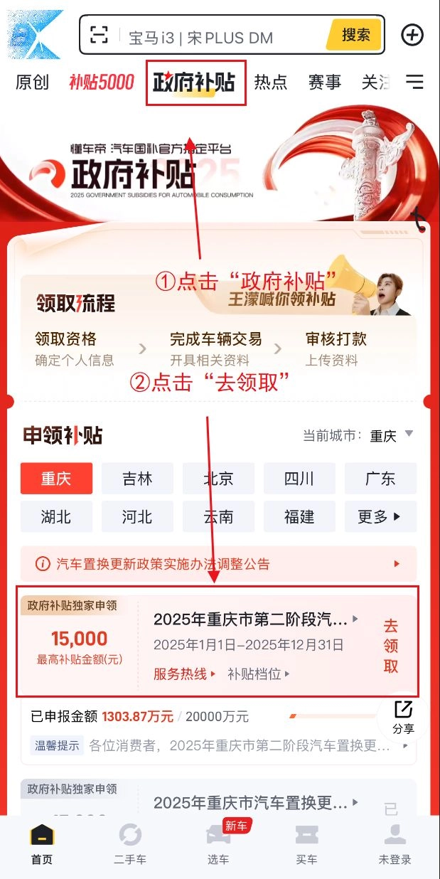 第一步:下载“懂车帝”APP,首页搜索“重庆”,或者直接点击搜索框下的“政府补贴”,点击“重庆”-“去领取”