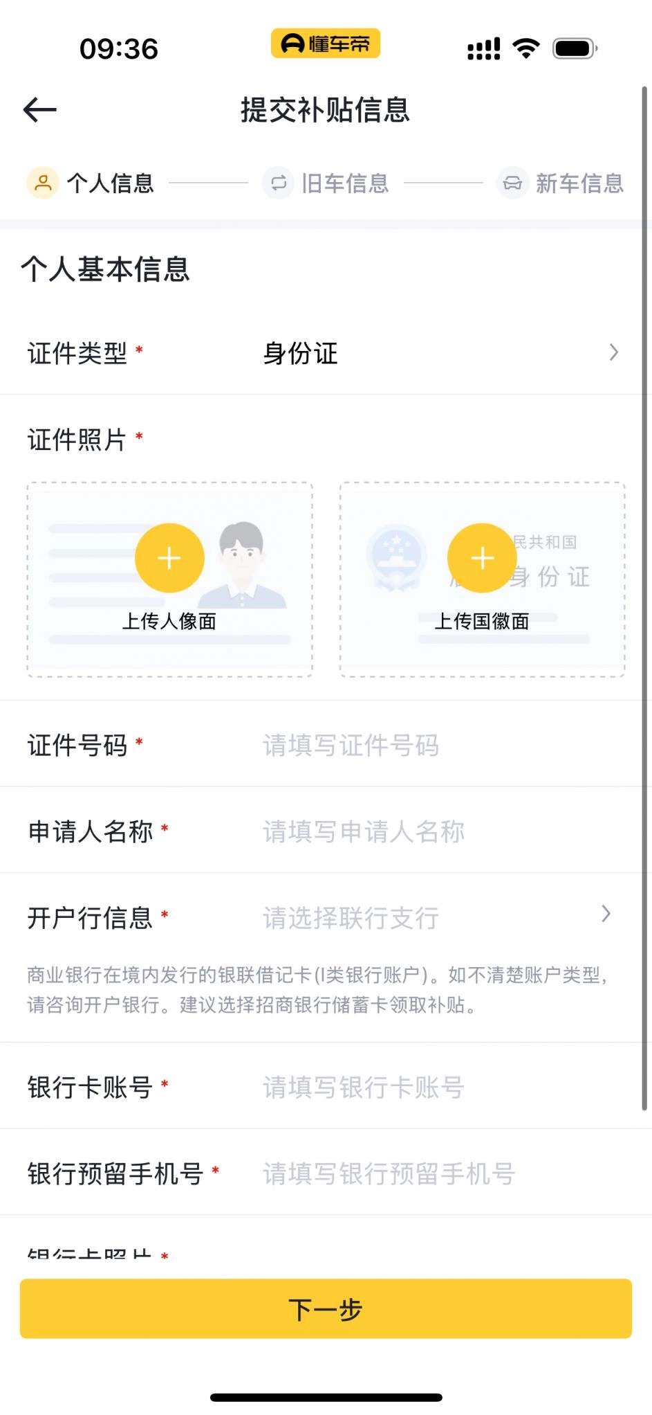 1.上传购买新车的个人消费者有效身份证正反面照片。