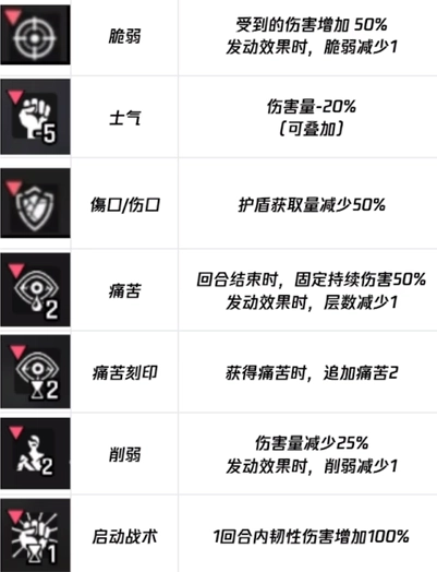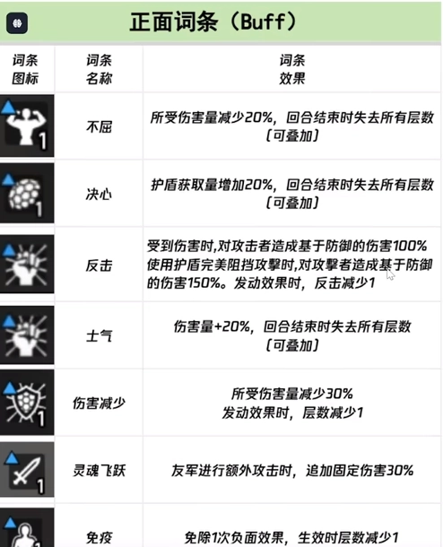 2、负面词条类指的就是减益的效果,其中包含5个属性,易伤类里面包括脆弱和痛苦,这两种属性可以让自己的角色遭受的伤害得到提高,并且会造成固定持续性的伤害,对角色的伤害力度是很大的。削弱士气类里面包括士气和削弱,这两个属性可以使伤害量减少1/4,但是发动时的效果层数将会减少一层。护盾限制类里面主要是以损坏这一属性为主的,这一属性将会使护盾的获取量减少50%。这样对护盾的伤害度将会降低一半。