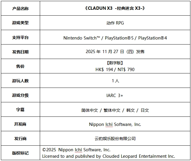云豹娱乐股份有限公司(总公司位于东京都品川区,董事长兼社长为陈云云)今日发布消息称,由总部设在岐阜县各务原市、董事长兼社长是猿桥健藏的Nippon Ichi Software, Inc.开发的动作角色扮演游戏《CLADUN X3 -经典迷宫 X3-》(支持Nintendo Switch™、PlayStation®5、PlayStation®4平台),其简体中文数字版已于2025年11月27日(星期四)在亚洲地区正式发售。