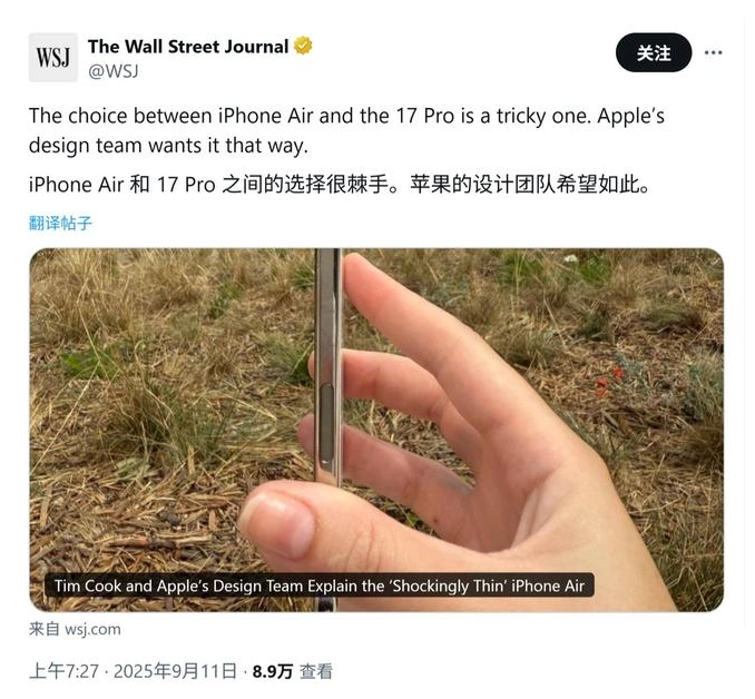 在接受华尔街日报采访时,苹果首席执行官蒂姆・库克(Tim Cook)、工业设计副总裁莫莉・安德森(Molly Anderson)和人机界面设计副总裁艾伦・戴(Alan Dye)谈到了新款iPhoneAir的设计理念。