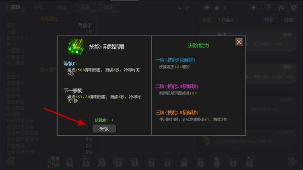 技能系统丰富,通过升级和进阶强化技能,每个技能三个进阶能力在5、10、15级解锁。