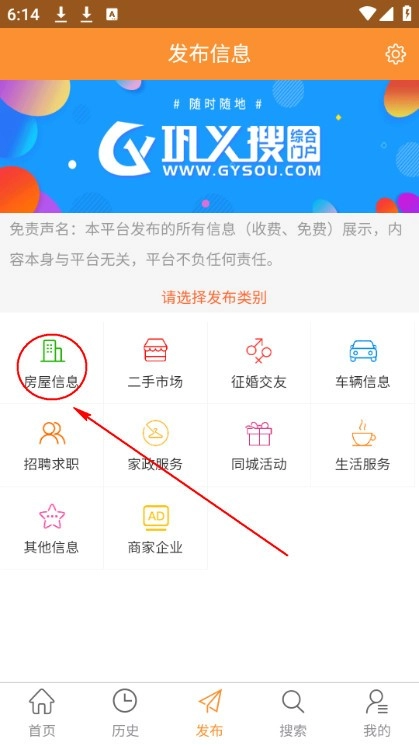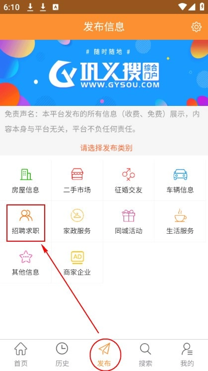 安装后打开应用,底部导航栏分为首页、历史、发布、搜索、我的五个部分。首页包含二手市场、求职招聘、房产租售、生活服务、车辆买卖、家政服务等分类。历史记录页面显示所有浏览轨迹,便于回溯信息。发布板块允许用户选择内容类型并填写详情提交。搜索功能支持关键词输入,快速定位目标信息。部分操作需手动刷新,避免数据滞后。