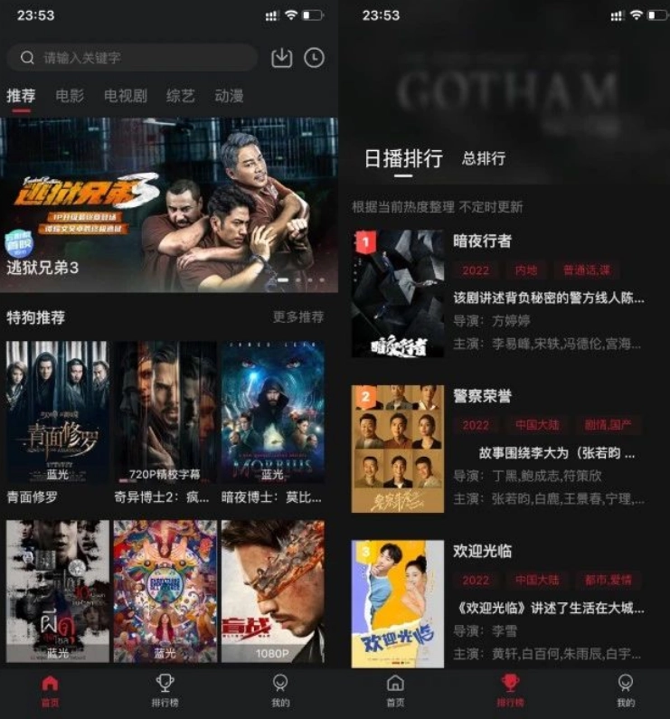 打开应用后,底部菜单栏仅三个选项:首页、排行榜、我的,界面极简。