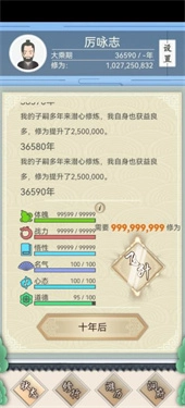 修为充裕后再生育,前五轮每轮投入100修为进行特训。传功给予1%修为奠定子嗣基础,其境界提升后将持续反哺修为。子嗣大限前适当传功助其渡劫,可延续收益。