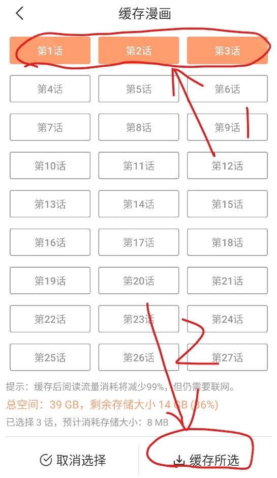 4、解锁完成后点击右上角X,即可进入缓存界面,选择需要缓存的漫画章节,然后点击右下角的缓存所选