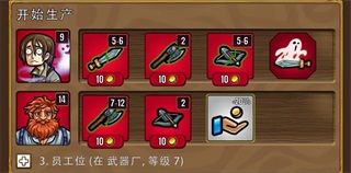 炼金术士建筑可以建造两个,其中一个用于生产生命药水,另一个则用来生产其他三种药水。建议主要升级生产这三种药水的建筑,而生命药水的数量足够使用即可。驯兽师建筑只需要一个,再多就显得多余了。酒馆同样需要建设两个:第一个专注于生产酒和食物,并且是主要升级的对象;第二个则负责生产松子酒和零食,只需保证能够招募两名英雄并拥有六个仓库格位即可,在酒馆达到20级之前将其升至6级已经足够,同时确保有十个仓库位置。武器制造厂也需要建立两座:主要升级的那个主要用于生产剑、斧头和十字弩,在游戏初期将其升到6级就已经很实用了;另一座仅需保持能够生产弓箭以及提供五个仓库格位的功能即可。可能有人会问为什么不是让一个建筑同时生产两种武器,而是让一座生产三种武器而另一座只负责一种,这是因为队伍配置上的考虑。
