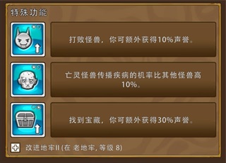 在同等条件下,全选获取箱子的声誉更多。我建议如果怪物等级不高于金箱子三级的话,就选择获取宝藏;或者如果你在墓地中选择的是其他效果,并且这些效果不增加声誉的话,也建议选择获取宝藏。这里以老地牢为例进行说明,其他情况我下次再补充,有兴趣的朋友也可以自己计算一下。在所有地牢中,黑暗神殿提供的加成效果最佳。当你拥有boss时,我不建议每天都放出一只,因为这样其实效果并不好,可以等到有任务需求时再放,并且最好放在加成效果最好的地牢里。