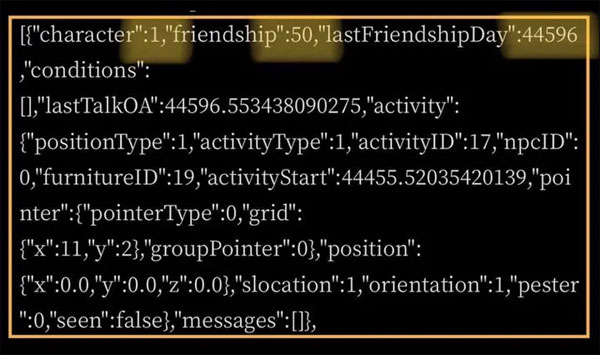 在你见过了目前所有的17个NPC之后,你复制粘贴出来的存档里将会看见这样19份关于NPC的存档信息: