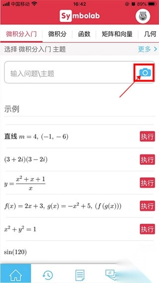 2、启动Symbolab数学应用,点击输入框右侧的照相机图标。