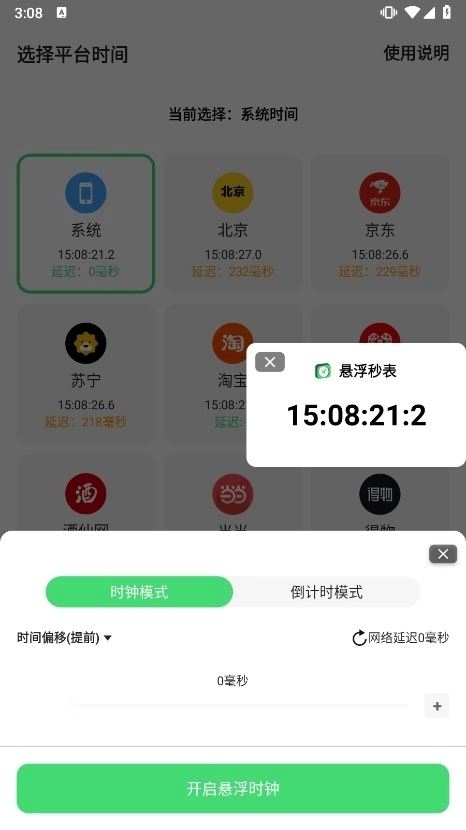 支持99小时持续计时,满足长时间活动记录需求。提供时钟与倒计时双模式悬浮窗,可在任意应用界面显示。实现毫秒级时间精度,支持三位小数显示及手动偏移控制。具备多渠道时间校准能力,覆盖北京时间、京东时间、淘宝时间等主流平台。独创网络延迟计算功能,有效提升电商抢购成功率。内置计时器群组管理系统,支持重命名、排序和分组控制操作。