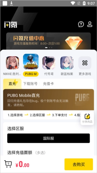 2.选择目标游戏如地铁逃生,进入直充模式并确认区服为国际服。