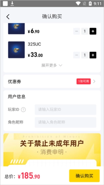 4.点击【去购买】,输入玩家ID和角色昵称,核对信息并使用优惠券。