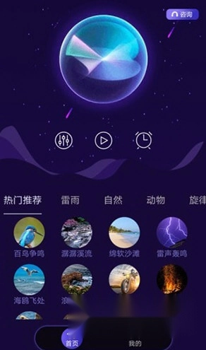 2、推荐页上下滑动切换声景场景,如炉火声到细雨声的沉浸转换