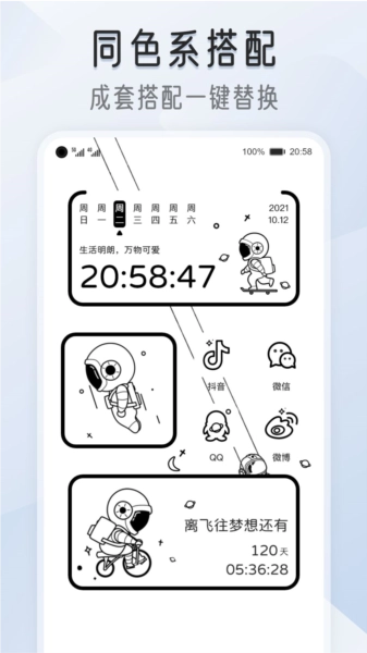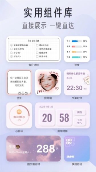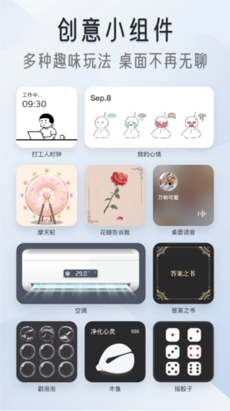 我的桌面iScreen提供多种实用面板:X面板在桌面展示手机系统信息;快捷面板快速打开目标应用如健康码、扫一扫;APP面板同时放置多个应用,保持布局整齐;天气面板、健康面板等丰富选择。高颜值时钟包括打工人时钟、大自然时钟、数字时钟、翻页时钟、表盘时钟、拟态时钟,以及可编辑文字的文案时钟,多种尺寸样式任选。创意小组件如超级解压的戳泡泡、敲木鱼,解决选择困难的小决定,环保型鲜花告诉我,带开关的电灯和空调组件,桌面语音组件,我的心情组件,万能答案之书,实用又好玩。动态小组件包括会动的风扇、摩天轮、风车,增添趣味性。倒计时组件支持简约设计或图片编辑,展示时间进度。图片组件提供简约图片和照片墙模板,自定义摆放照片。任务组件如小习惯、小目标每日打卡,任务清单清晰展示。语录组件每日一读,支持自定义或系统更换。日历组件多个精美样式可选。