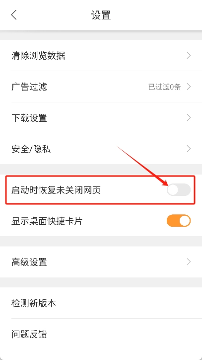 4、进入设置界面查找启动时恢复未关闭网页选项。