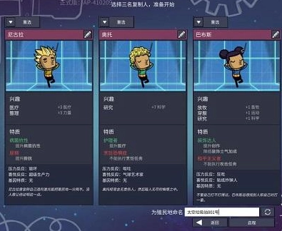任务00:优先选择抗压能力强的科学家与运动员,避免"无法科研"负面特质。初期三人组覆盖挖掘、建造、研究即可。