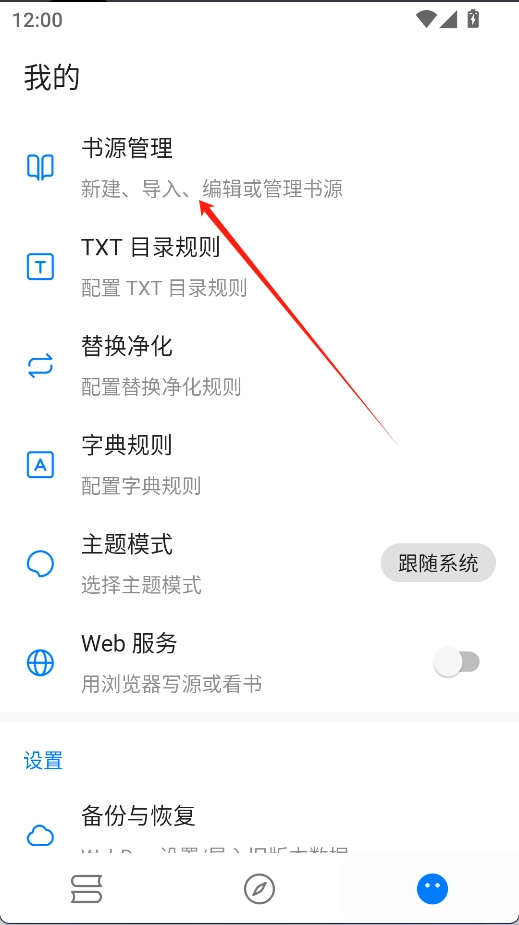 菜单列表选择“书源管理”选项,打开配置面板。