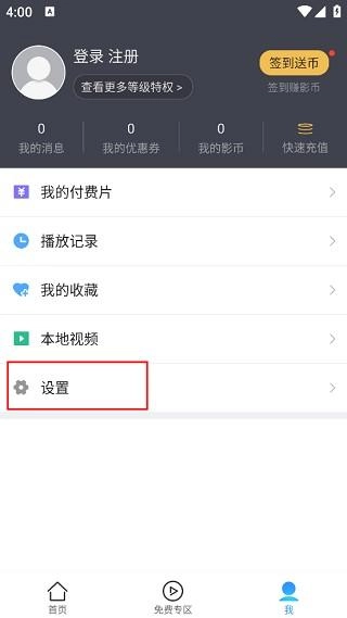 2. 切换到个人中心界面后,在这里可以看到我的播放记录、收藏视频等,需要点击列表中的"设置"选项