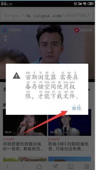 5、设置一下权限,点击“继续”,在弹出的窗口中选择“允许”就会自动该视频了。