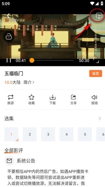 3、进入播放界面,点击右上角TV图标。