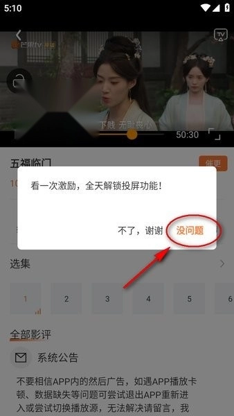 4、根据提示观看一次广告解锁全天投屏权限。