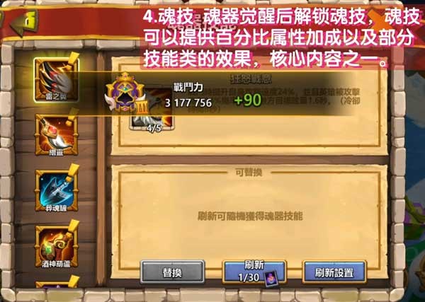 5、魂器精炼 大幅度提升英雄属性,尽可能的选择单一属性,有额外的魂技等级提升效果。