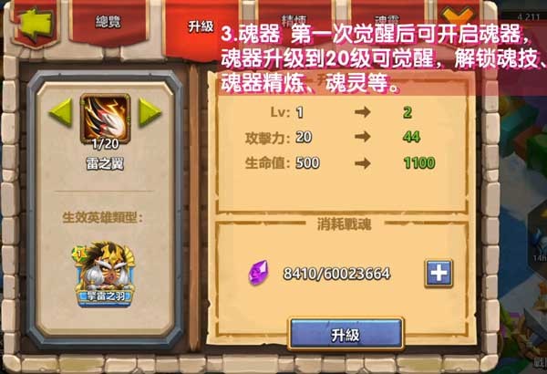 3、魂器 第一次觉醒后可开启魂器,魂器升级到20级可觉醒,解锁魂技、魂器精炼、魂灵等。