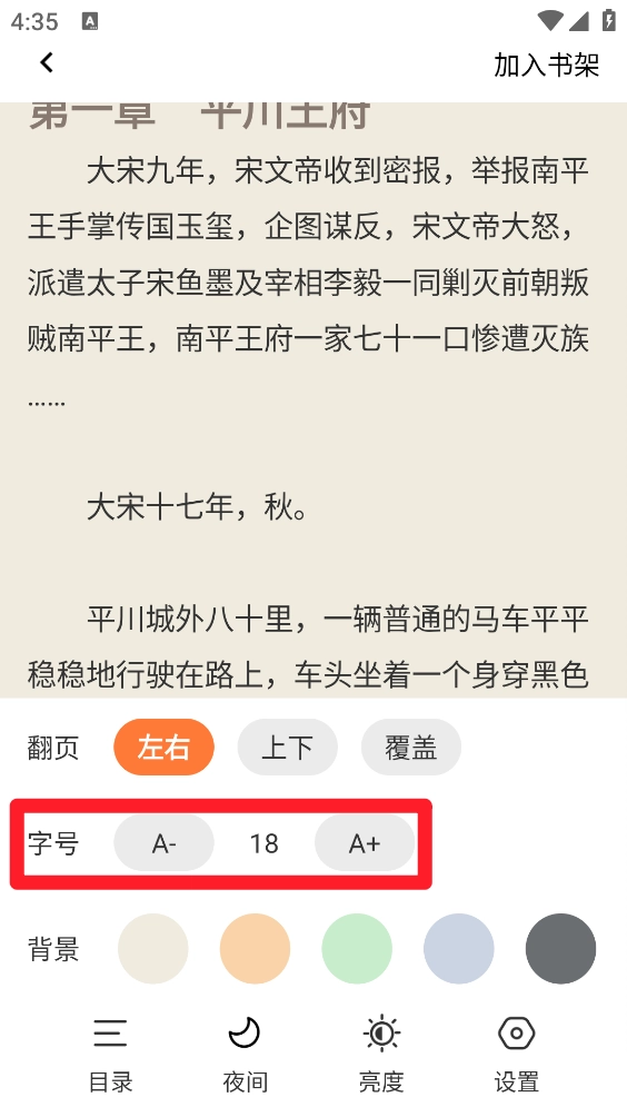 4.轻触屏幕中央唤出设置菜单,通过A+/A-按钮调整字号