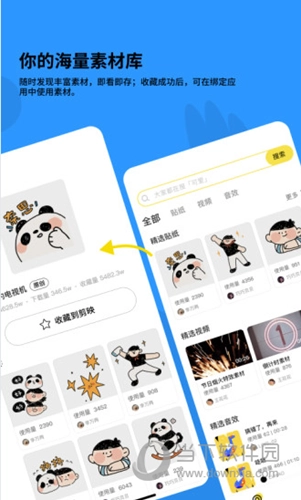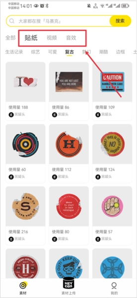 1、在素材界面中根据贴纸、视频、音效分类选择喜欢的素材。