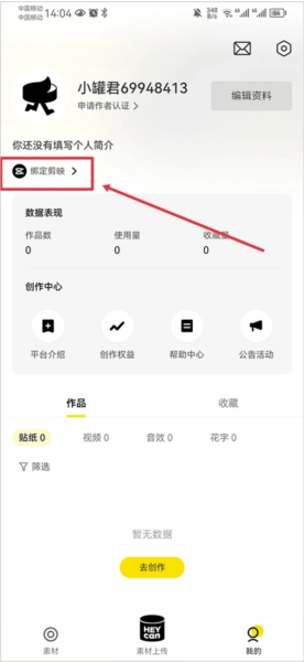 1、在“我的”界面中点击个人简介下方的“绑定剪映”。