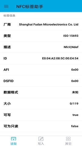 2、成功识别后查看标签详细信息,包括厂商、存储容量等核心参数
