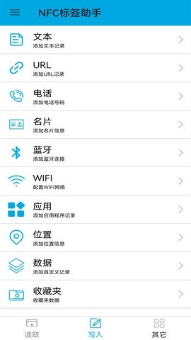 3、进入写入界面选择数据类型,可添加文本、网址、联系方式等内容