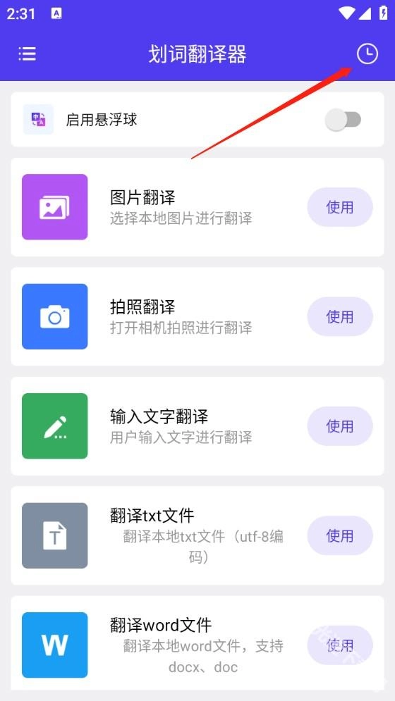 打开应用首页,点击右上角历史图标。