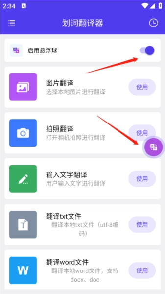 点击功能按钮如“文字翻译”,输入查询内容后确认。