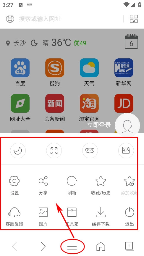 4. 菜单键(三条横线)展开设置面板,包含书签管理、历史记录等