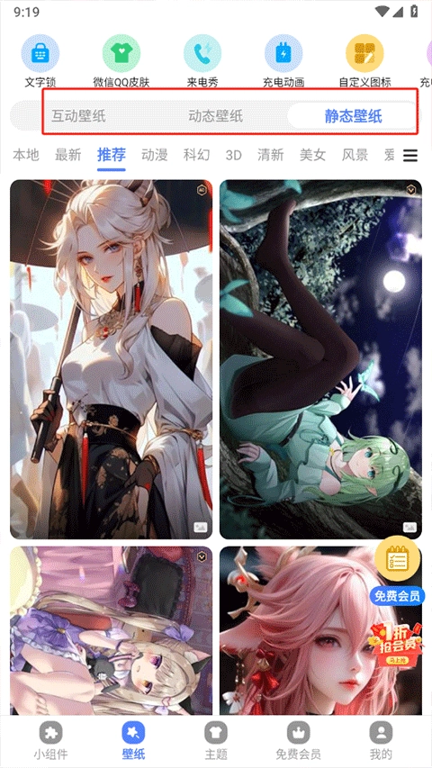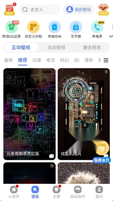 2、打开软件后进入"壁纸"模块,浏览推荐或分类中的互动壁纸、动态壁纸或静态壁纸,选择一张心仪的图片。