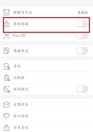 3. 开启“隐私密码”开关,激活保护机制。