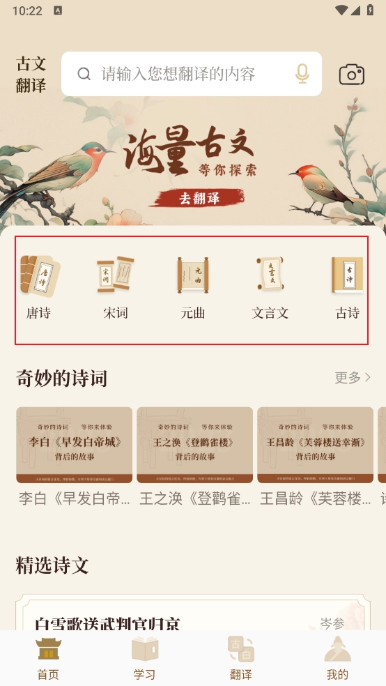 古文翻译器是一款专业的古代文学翻译工具,专注于精准解析古诗、文言文等内容,为用户提供高效的学习辅助。通过文本输入、拍照识别或语音输入,软件能快速生成白话文翻译,并附有详细的字词解释和背景知识。内置丰富资源涵盖从小学到大学的教材诗词,包括诗经、楚辞、唐诗、宋词等经典作品,适合学生、学者和文学爱好者使用。移动端设计让用户随时随地享受沉浸式学习体验,国风主题界面营造诗意氛围,帮助深入理解古代文化魅力。古文翻译器app支持多语言翻译和智能搜索,简化操作流程,让古文学习变得轻松有趣。